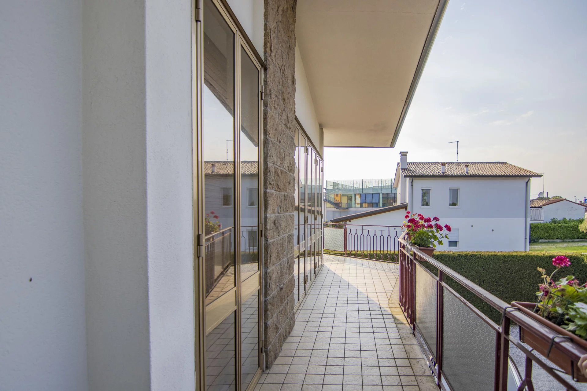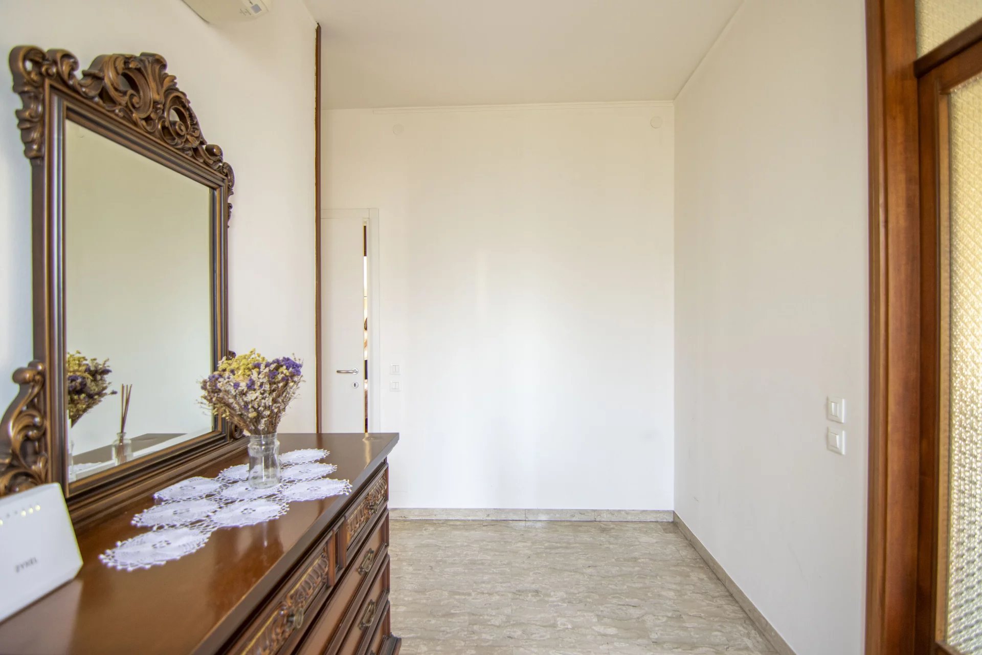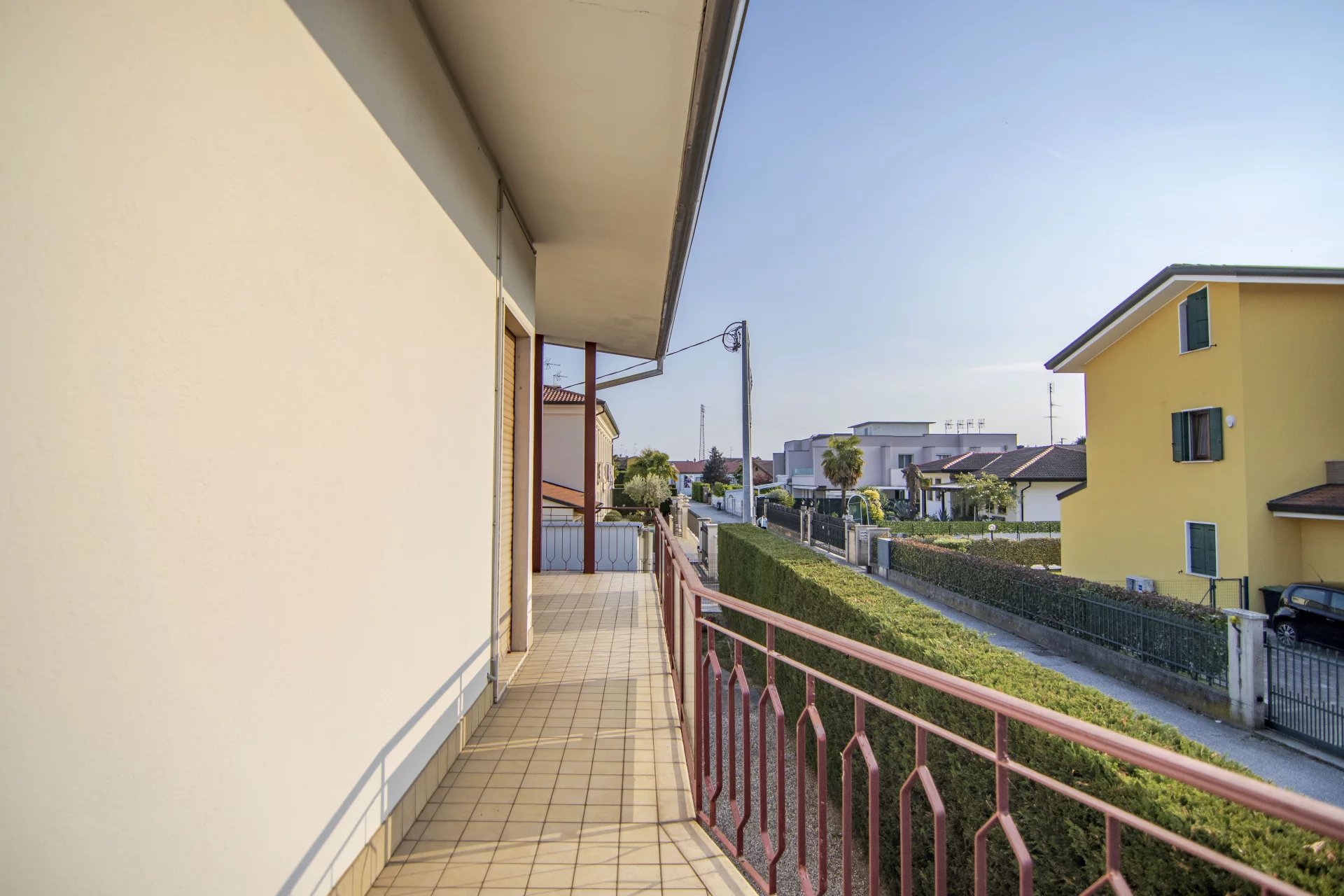 Al piano primo, con altezza interna di 2,90 metri, si sviluppa l’abitazione principale. La zona giorno è composta da una cucina separata e abitabile e da un soggiorno ampio e luminoso con affaccio su un grande terrazzo angolare. La zona notte offre tre camere da letto di cui due matrimoniali e una doppia, e un bagno finestrato. Gli infissi della zona notte sono stati sostituiti con nuovi serramenti in alluminio con vetrocamera e in tutta la casa sono presenti tre split per l’aria condizionata, uno al piano terra e due al piano primo.