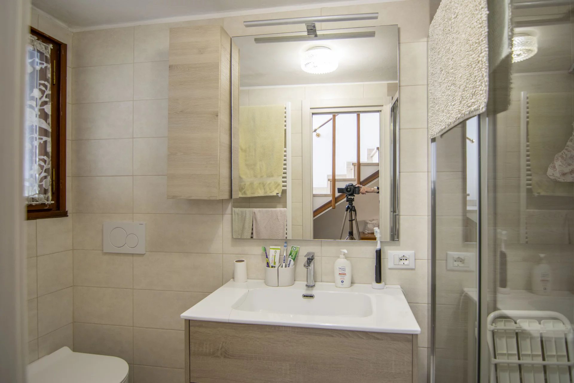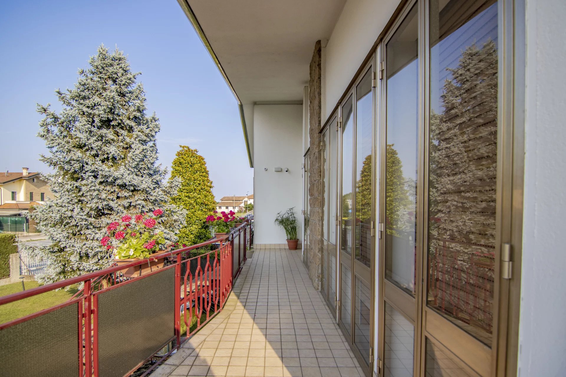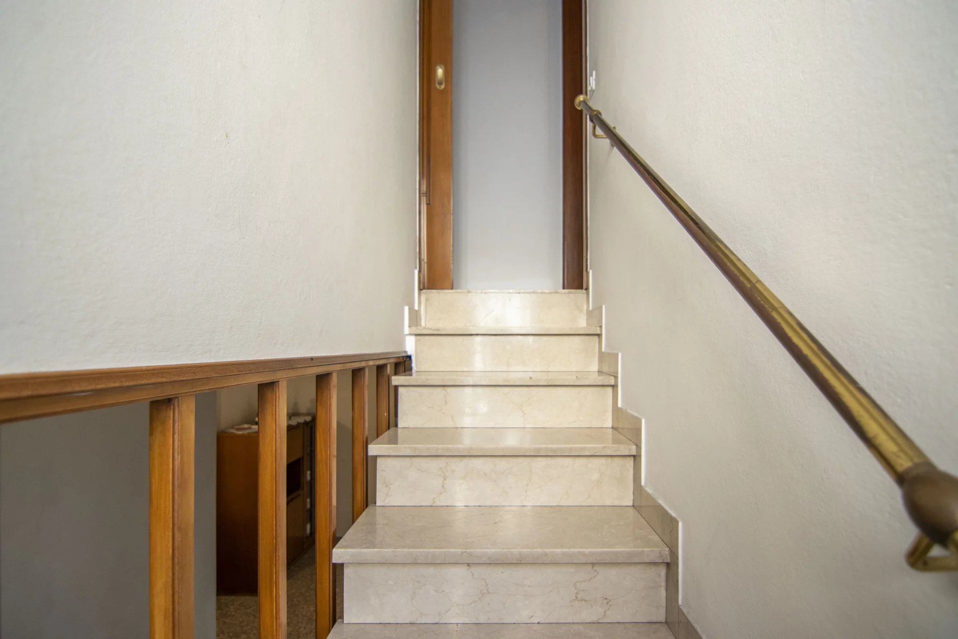Al piano primo, con altezza interna di 2,90 metri, si sviluppa l’abitazione principale. La zona giorno è composta da una cucina separata e abitabile e da un soggiorno ampio e luminoso con affaccio su un grande terrazzo angolare. La zona notte offre tre camere da letto di cui due matrimoniali e una doppia, e un bagno finestrato. Gli infissi della zona notte sono stati sostituiti con nuovi serramenti in alluminio con vetrocamera e in tutta la casa sono presenti tre split per l’aria condizionata, uno al piano terra e due al piano primo.