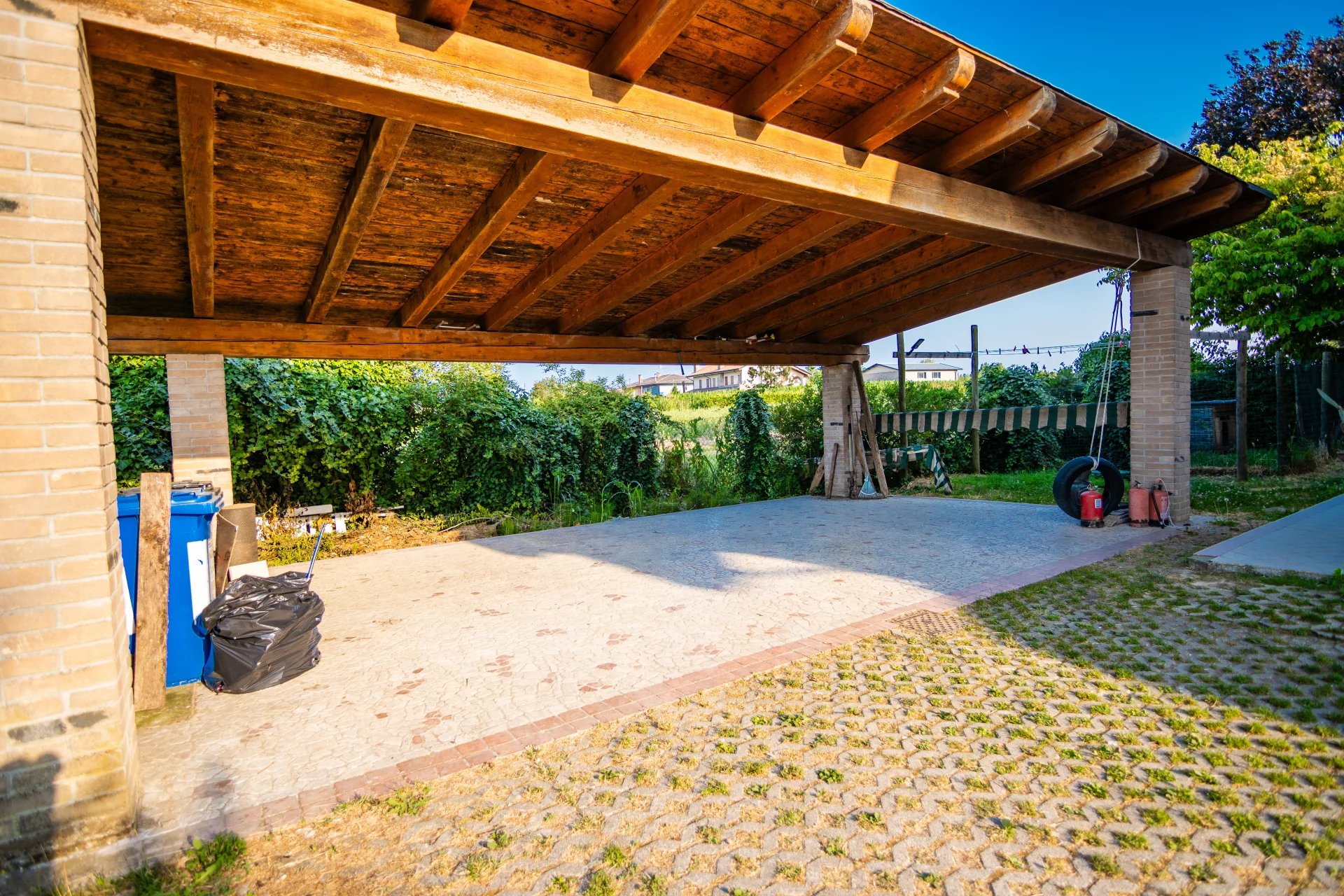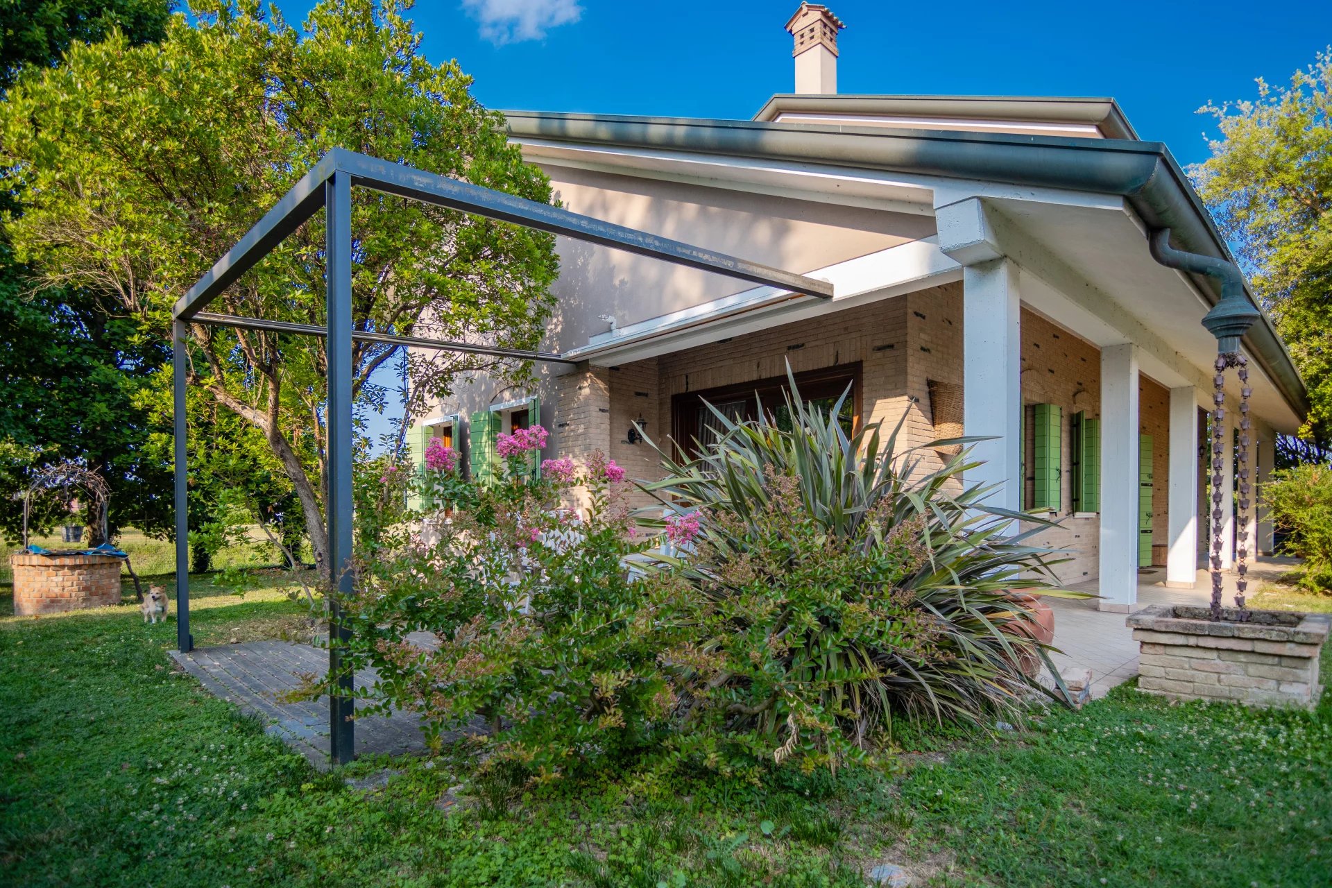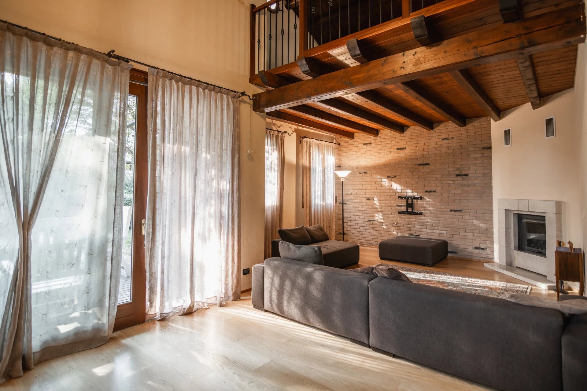 La zona giorno si sviluppa al piano terra e si apre su un’ampia area living con cucina a vista di oltre 70 mq, arricchita da camino e grandi vetrate che affacciano sul portico e sul giardino. A completare il piano terra troviamo un bagno con doccia, locale tecnico, disimpegno e garage comunicante. All’esterno, un giardino privato di circa 1.300 mq, curato e ben piantumato, dotato di impianto di irrigazione alimentato da pozzo e completamente recintato, offre il massimo della privacy e della tranquillità.