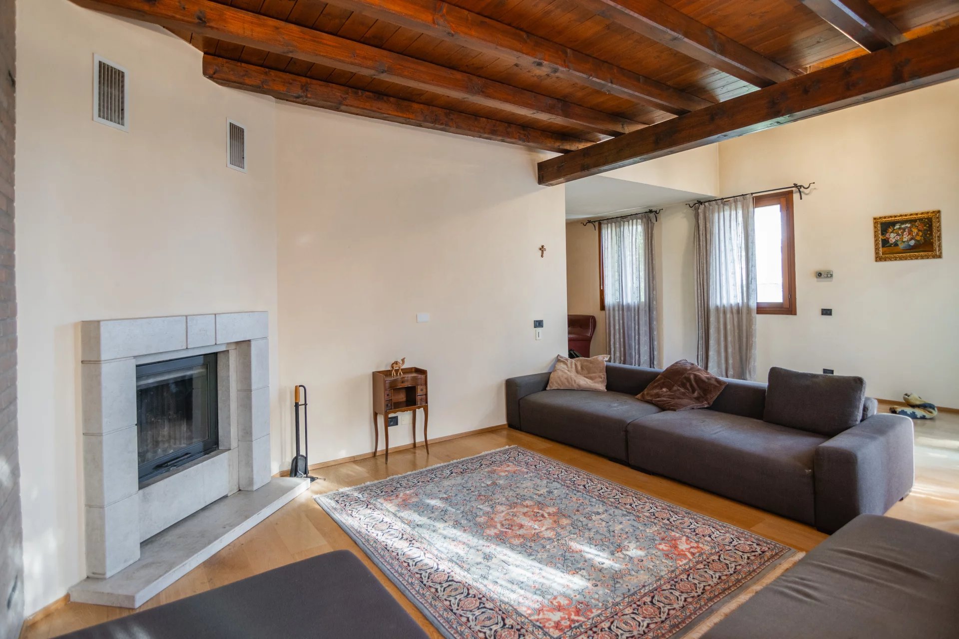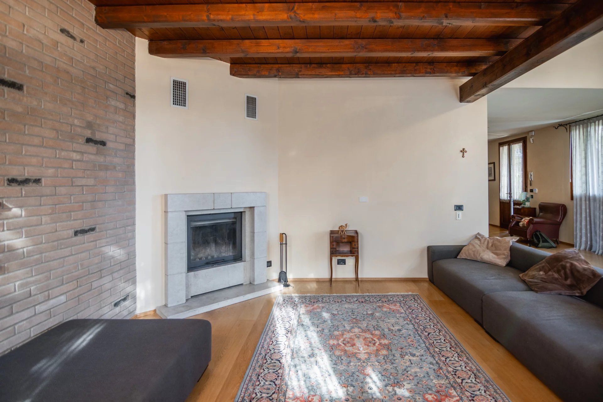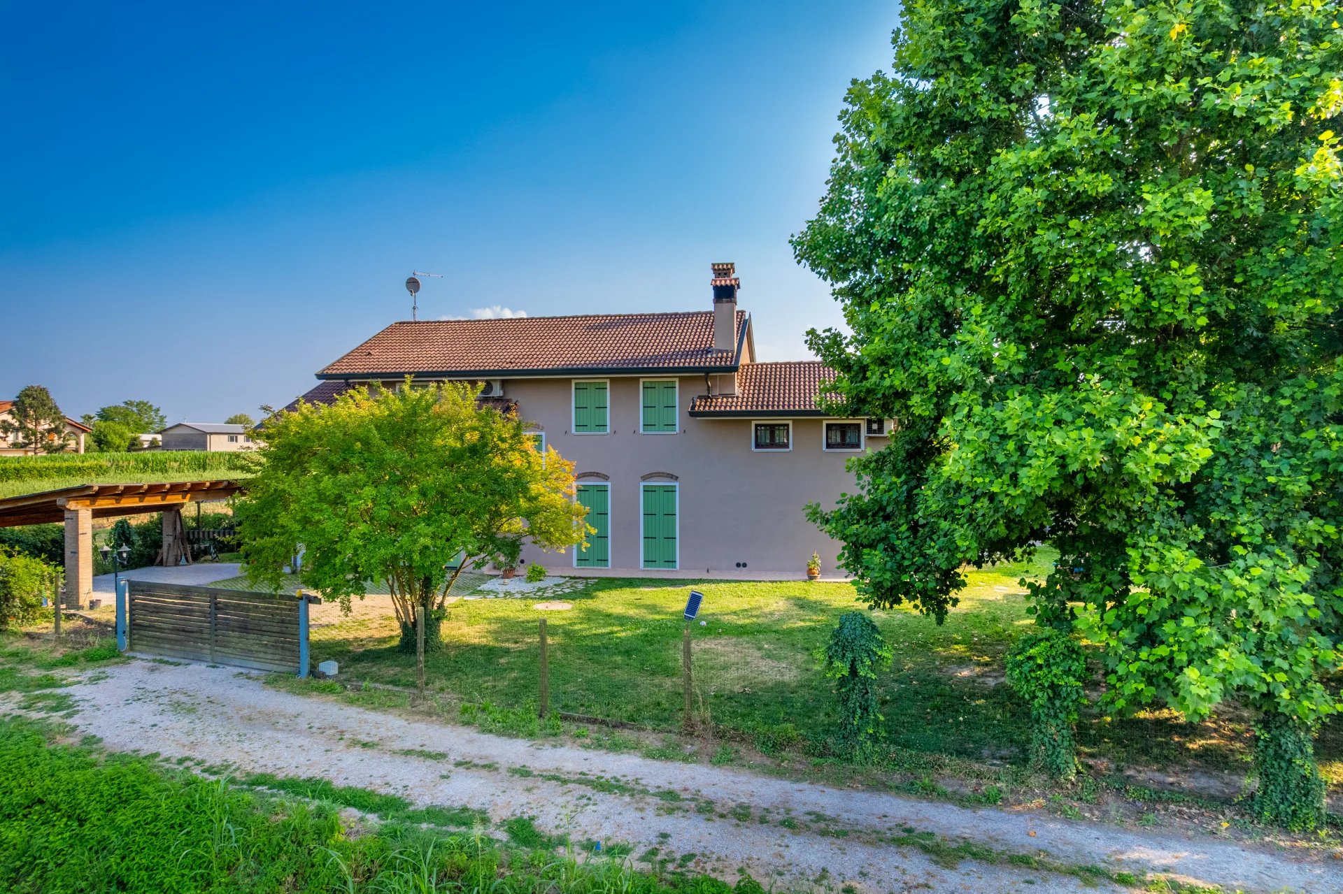 La zona giorno si sviluppa al piano terra e si apre su un’ampia area living con cucina a vista di oltre 70 mq, arricchita da camino e grandi vetrate che affacciano sul portico e sul giardino. A completare il piano terra troviamo un bagno con doccia, locale tecnico, disimpegno e garage comunicante. All’esterno, un giardino privato di circa 1.300 mq, curato e ben piantumato, dotato di impianto di irrigazione alimentato da pozzo e completamente recintato, offre il massimo della privacy e della tranquillità.